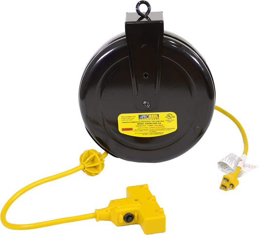 Alert 8150M-P Heavy Duty Industrial Retractable Extension Cord Reel w/Tri-Tap, 50 ft, Black, Yellow