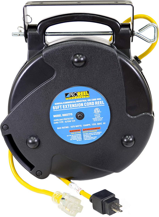 Pro 65 Foot 12/3 Quad Tap Industrial Retractable Heavy Duty Extension Cord Reel 8665TFQ